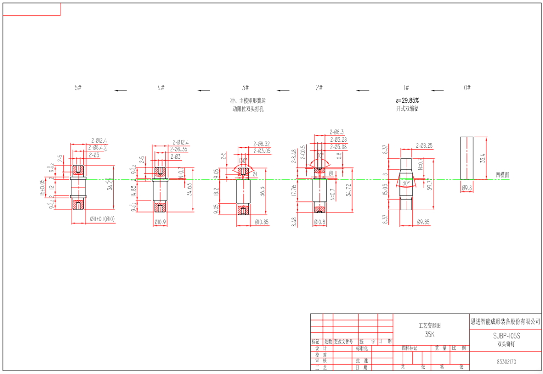 思進智能成形裝備股份有限公司以客戶現實需求為依托,不斷剖析雙頭鉚釘產品工藝變形的特點,提出能夠同時滿足尺寸精度及輕量化設計要求的創新型模具設計方案:該方案采用開式雙縮徑的冷擠壓模式及雙向矩形簧運動限位鐓孔工藝,有效提升了冷成形力的使用效率,縮減了產品的預成形次數;引入哈夫模設計工藝,通過計算調整浮動沖模行程,實現雙頭鉚釘中間縮徑的輕量化設計要求。